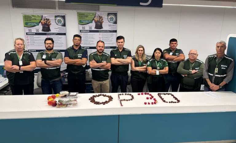 A ação integra o plano especial de segurança e controle sanitário coordenado pelo Ministério da Agricultura e Pecuária (Mapa). Cerca de 40 servidores participam da operação, conduzida de forma integrada com a Polícia Federal (PF), a Receita Federal do Brasil (RFB), a Agência Nacional de Vigilância Sanitária (Anvisa), o Núcleo de Operações Aéreas (NOA), o Ministério das Relações Exteriores (MRE) e a Agência Nacional de Aviação Civil (Anac).