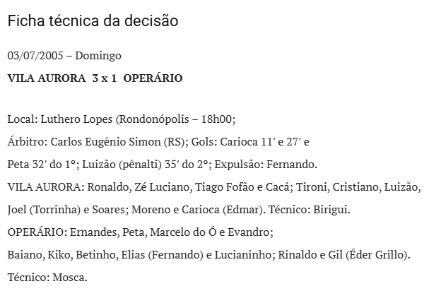 Na grande decisão contra o Operário de Várzea Grande, empate em 2 a 2 no primeiro jogo. No segundo, vitória por 3 a 1, com dois gols de Carioca, selando o título estadual de 2005. Carioca era reserva de Coelho, que estava cumprindo suspensão e não jogou aquela final.
