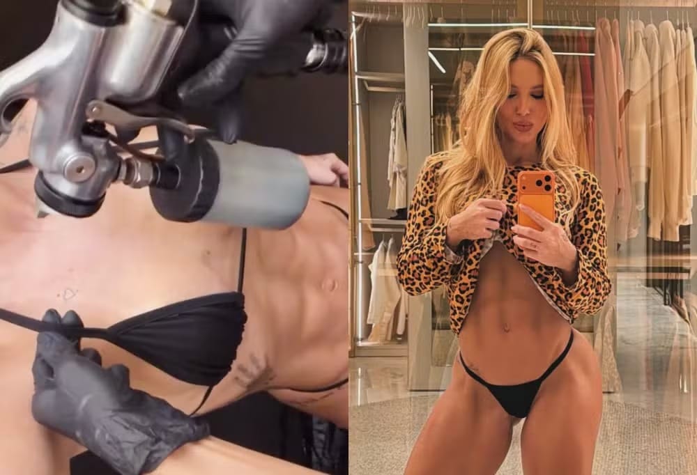 Depois do passo a passo, veio o registro do resultado. No espelho do luxuoso closet, ela posou só com a parte de baixo do biquíni, ergueu a blusa estampada e escancarou a marca do bronze, deixando em destaque o abdômen definido e o corpo sarado.