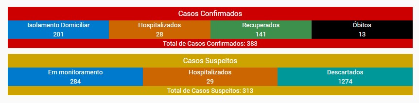Os números ainda apontam para o registro de 21 novos casos nas últimas 24 horas. O volume total de pessoas infectadas passou de 362 no domingo para 383 no dia de hoje.