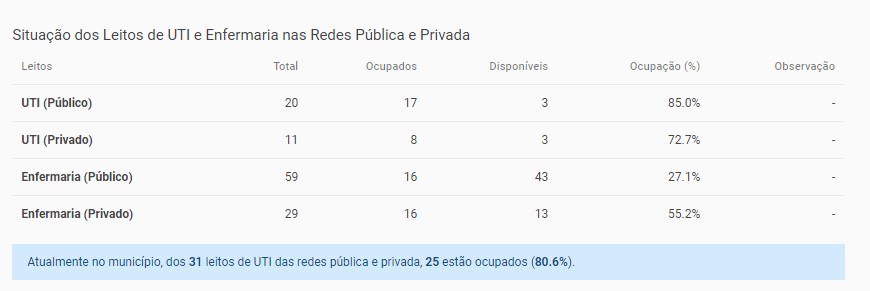Na rede pública são 17 leitos dos 20 ocupados e na rede privada são oito dos 11 leitos ocupados.
